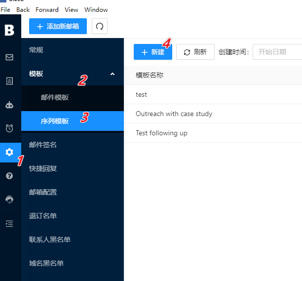 新建mail group序列邮件自动跟进 利用序列模板创建,方便后期复用。 也可以直接进入左侧菜单栏“自动化”-“活动”,新建活动,通过手动编辑序列邮件创建。保存序列模板。 进入活动创建: 点击发送就开始开启。 发送情况,见活动列表。 邮箱工具教程目录